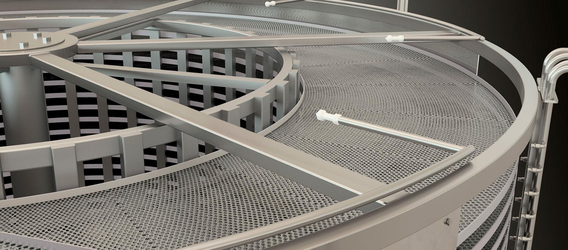 En el caso de un congelador en espiral de un solo tambor, el proceso de limpieza estándar se divide en 6 segmentos: 4 segmentos que cubren la cinta mediante barras de boquillas verticales y 2 segmentos colocados en la parte superior con boquillas giratorias.