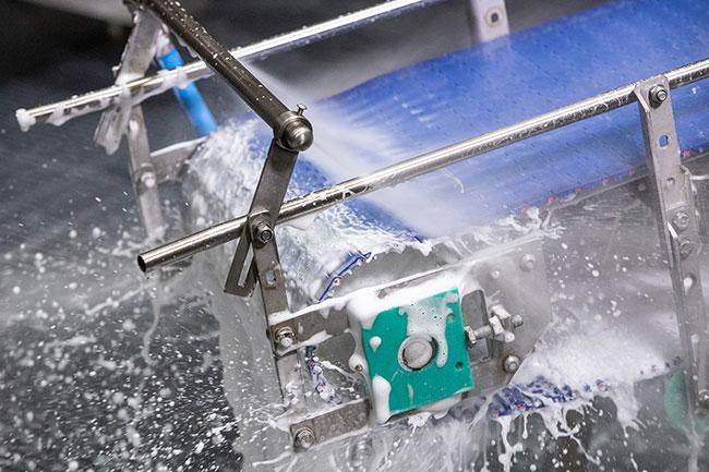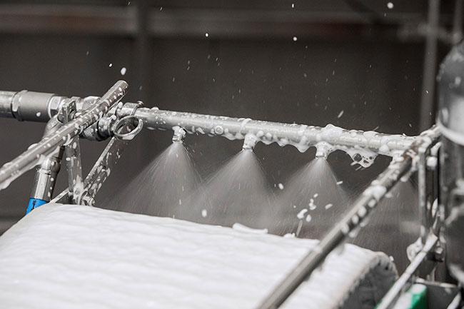 Las barras de boquillas se colocan en lugares estratégicos dentro y fuera del transportador para garantizar que cada centímetro de la cinta se limpie y desinfecte para evitar el crecimiento microbiano. El sistema es modular y puede combinarse para adaptarse a los requisitos de todos los transportadores.