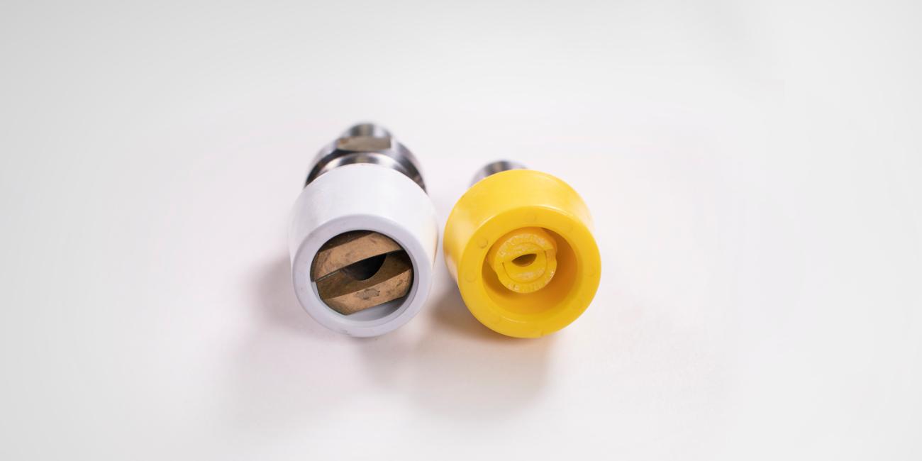 El agujero en la boquilla de espuma (protector blanco) o en la boquilla de desinfección (protector amarillo) está bloqueado por los residuos químicos